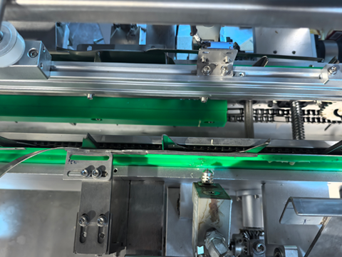 1)、物料输送带用于放置产品,该输送带可根据产品的大小规格调整:松开两个螺丝交叉移动,就可以推料格进行调节。