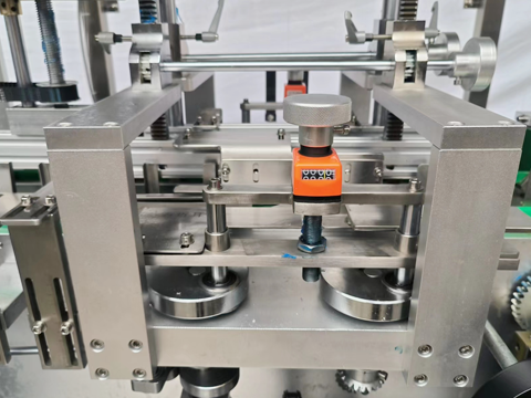 1)、当产品装入纸盒内,机器自动进行两边折 耳及折页(如图)。 2)、此位置是调节机器长/宽/高的具体部位,若需换另一尺寸盒子,此位置需要调节精确。此机构附有保护玻璃罩面,以防其他物质突然触碰而影响机器运行的稳定性。